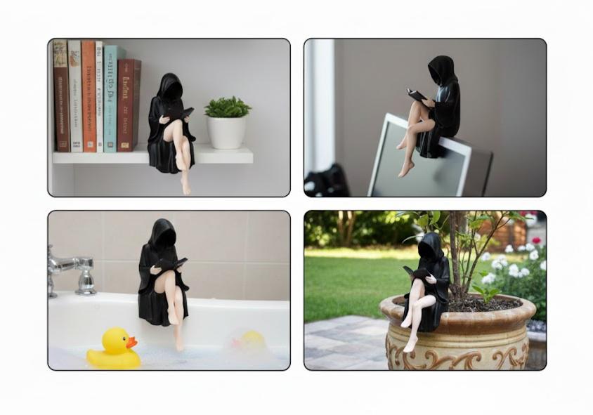 Okuyan Ölüm Figürü, gotik temalı dekoratif objeler arasında öne çıkan, hem karanlık hem de eğlenceli bir anlatı sunan özel bir tasarımdır.